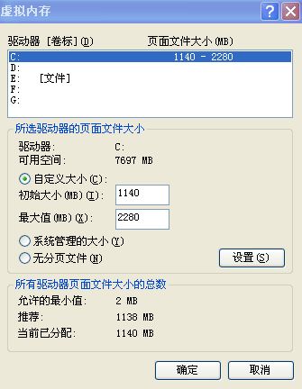我电脑的内存有2根,512+256组成,不知道该怎么设置虚拟内存的最大`最小值...看了好几篇论坛里的关于虚拟内存设置的方法~~555555~~可能因为我太菜~~看不太懂~~麻烦哪位高手直接告诉我应该设置为多少可以吗?我平时玩下2D游戏.QQ等...