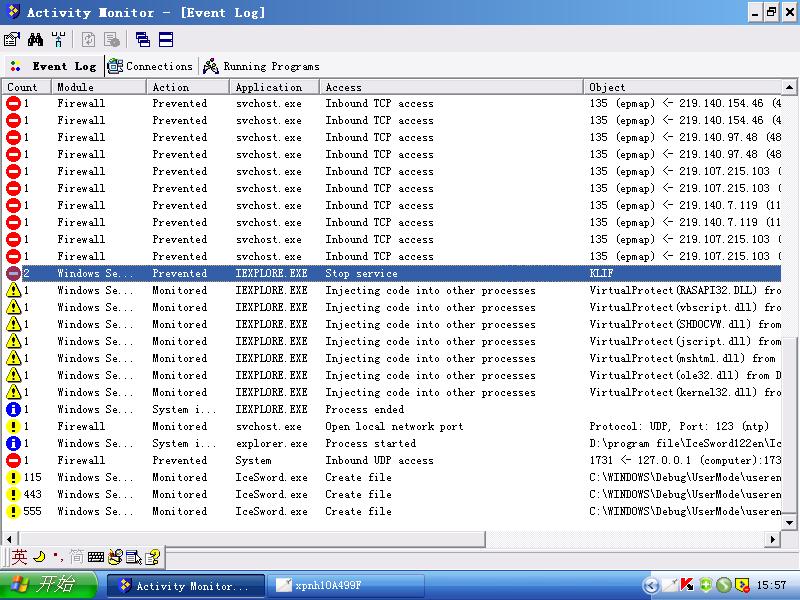 常常,我的IE竟然企图关闭卡巴Kis6的主要服务模块klif.sys,虽然每次都被tiny、SSM等的正确设置防住了,我动用一切手段,也见不到丝毫的病毒、木马、隐藏的代码、dll插入什么的蛛丝马迹,但IE为什么有这举动咧?斑竹和懂得的高手给点说法,请!(如图)