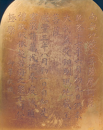 佛像通体鎏金,灿烂悦目。造型准确,五官秀美,颇具永乐时期造像的神韵。造像背光、底座为锤揲而成,装饰狮、象等六拏具,玲珑剔透,精美华丽。其工艺风格带有鲜明的西藏特征,可称是一尊藏汉风格完美结合的造像精品。