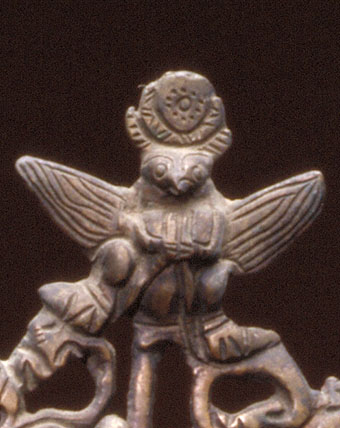 造像铜质,黑红光润,表面工艺精细,外形及装饰细部模仿克什米尔像。菩萨面庞消瘦,戴三角冠叶珠宝冠,长辫披肩,右手施无畏印,左手握莲花茎。左肩搭羊皮,身材细长,姿态僵硬,虽缺少克什米尔像肌腱发达粗壮有力的特点,但已开始显露早期西藏佛像的朴拙神韵。