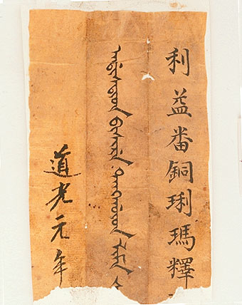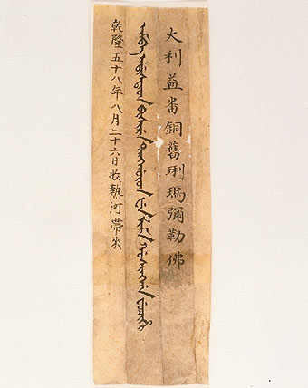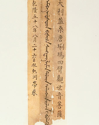 四臂观音又称六字观音,是由六字真言所化现的观音,为藏传佛教诸多观音形象中极为重要的一种,广受尊崇。坐像附黄条:“大利益桑唐琍玛四臂观音菩萨,乾隆五十八年八月二十六日收热河带来。”