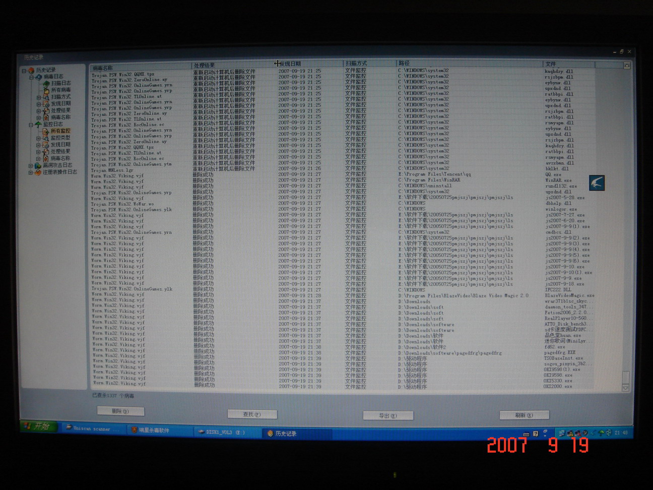 今天升级瑞星后杀毒,只要打开我的电脑里的任一盘中的任一目录,瑞星就会将此目录中的所有可执行程序不分青红皂白全部删除,惨啊!最后看看瑞星的记录更惨,从C盘开始只要是可执行程序全被瑞星自动删除。最后只好将瑞星关闭,可此时我的电脑已经被瑞星删的面目全非。强烈抗议瑞星如此恶劣的行径!!注:我的瑞星是从当当网邮购的地地道道的正版。