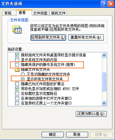 2.anturun.exe和autorun.inf找不到,可以把隐藏文件和系统都显示出来就能看到了,打开我的电脑/工具/文件夹选项/查看/高级设置,然后做如图设置,设置后就能看到了,把它们都删除了。