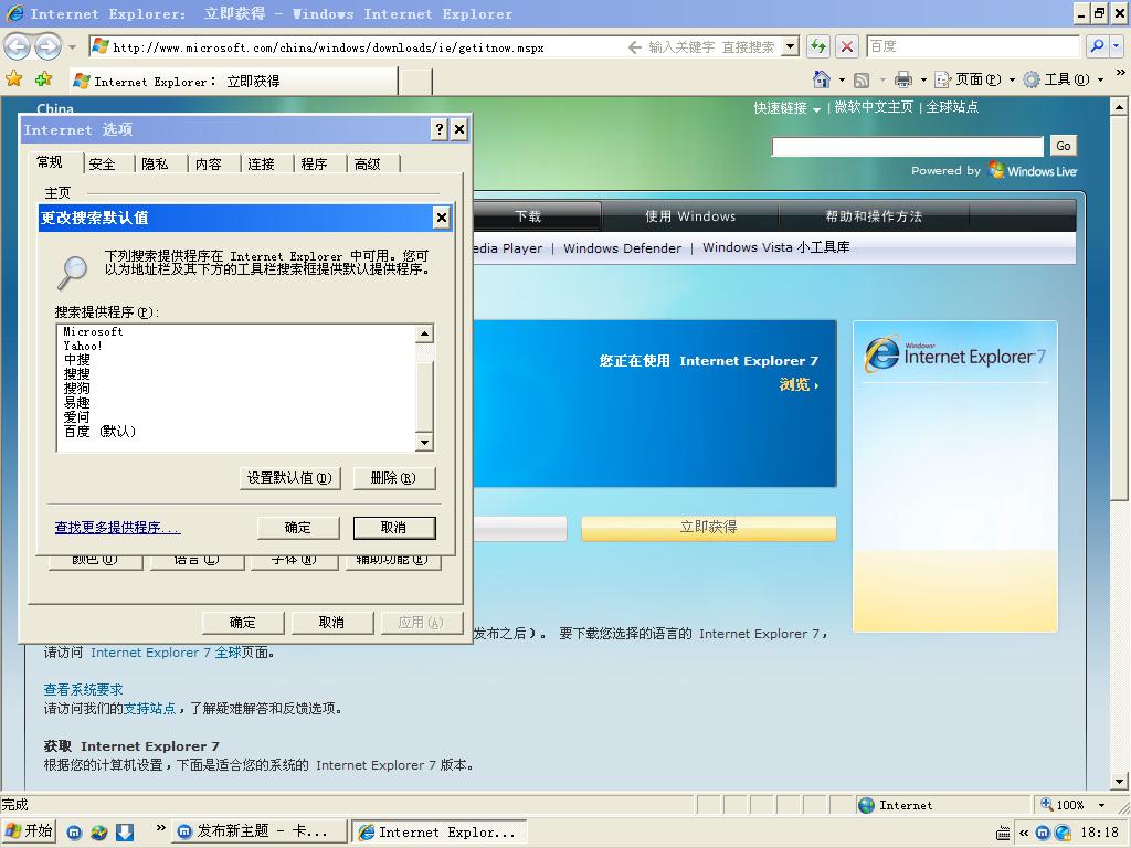IE7>工具》intelnet选项》常规选项卡》搜索“设置”在这里更改了也不能变成设置好的搜索