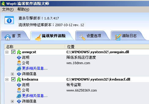 我用卡卡、360和瑞星及防火墙,均查不出木马和病毒了,闲着没事干的时候,偶尔用了一个优化大师扫描了一下,不扫描还好,一扫描吓一跳,如图:这两个流氓,我前一段就清理过,为什么过几天还会崩出来,是不是在其它地方隐藏的还有,望高手帮我把老窝给找出来。