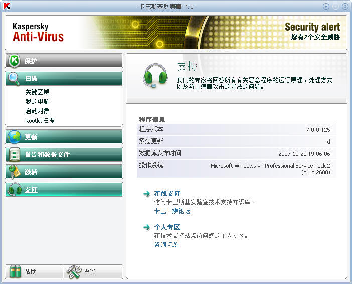 卡巴版本7.0.0.125 病毒库发布时间2007-10-20 19:06:06