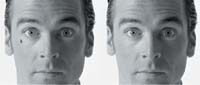 图左边的人像脸上有一个小污点,影响了整幅照片的效果。下面我们就想办法去除这小小的遗憾。在工具面板中选取矩形选框工具,在污点近旁选取一块面积略大于污点的矩形选区;在选单栏中点选“编辑→定义图案”;按“Ctrl+D”,取消选区;在工具面板中选取图案图章工具,并在“画笔”调板中选取和污点大小相当的虚笔触,用图章从上到下在污点上涂抹,即可去除污点,效果如图右边图所示。