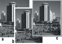 先打开一幅照片(如图a);通过“图像→画布大小”,弹出“画布大小”对话框,将画布宽度和高度值修改为“原宽(高)度+2倍的相框宽度”(本例相框宽度为8毫米),以在照片四周加上一个指定宽度的白框(如图b);在工具栏中选取魔棒工具,并在“魔棒选项”调板上对“容差”作适当设定(本例中为10),魔棒单击白框,选中全部白框区域;单击“图层”调板下部的创建新图层按钮;单击“色板”调板,选取你喜欢的相框颜色(本例颜色值:R 200,G 164,B 110)作为前景色;在选单栏中打开“编辑→填充”,弹出“填充”对话框,将对话框中的“内容”设置为“前景色”;打开“滤镜→杂色→添加杂色”,将“数量”设置为合适值(本例为13),“分布”设置为“高斯分布”;打开“滤镜→模糊→动感模糊”,弹出“动感模糊”对话框,“角度”设置为45度,通过预览窗口将“距离”设置为合适值(本例为6);按“Ctrl+D”,取消选区;打开“图层→效果→斜面和浮雕”,将效果类型设置为“斜面和浮雕”,“样式”设为“内斜面”,通过图像窗口预览将“深度”设置为合适值(本例为6);单击“图层”调板,点击其右上角的黑色实心小三角,点选“拼合图层”。整个过程完成,效果如图c所示。