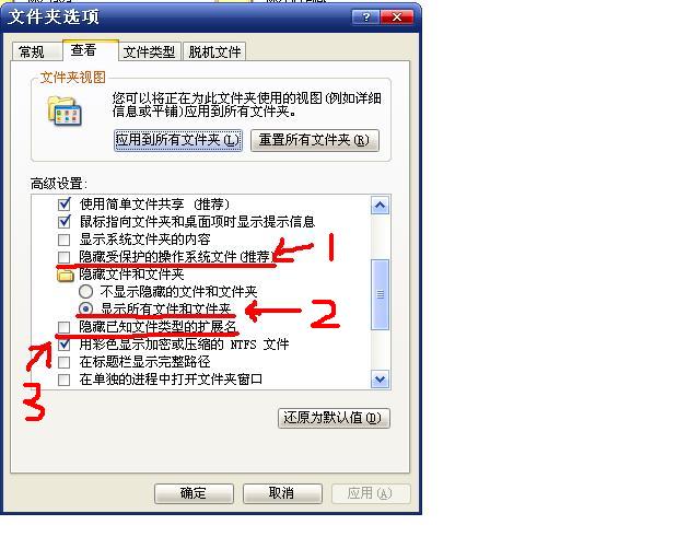 我的电脑——工具菜单——文件夹选项(没有的话用卡卡助手修复)——查看,然后按照下图设置