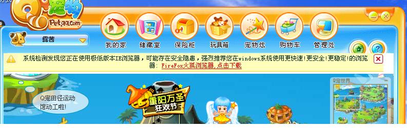 前几天为了下载游戏明星三缺一,我点击了几个链接后老是去火狐的宣传网页。当时我的IE是6.0的,从那以后我再上网网页上(包括QQ宠物中)就会出现“系统检测你正在使用极低版本IE浏览器,可能存在安全隐患,强烈推荐你在Windows系统使用更快速!更安全!更稳定!的浏览器:FireFox火狐浏览器,点击下载”的提示语。为此我把IE升级为7.0,还装了火狐浏览器,一般网页上没有了,QQ宠物和迷你网页上还是出现!无奈我又把QQ重下了一个,还是有!我真的没办法了,有谁知道这是怎么回事?怎么解决这个问题?