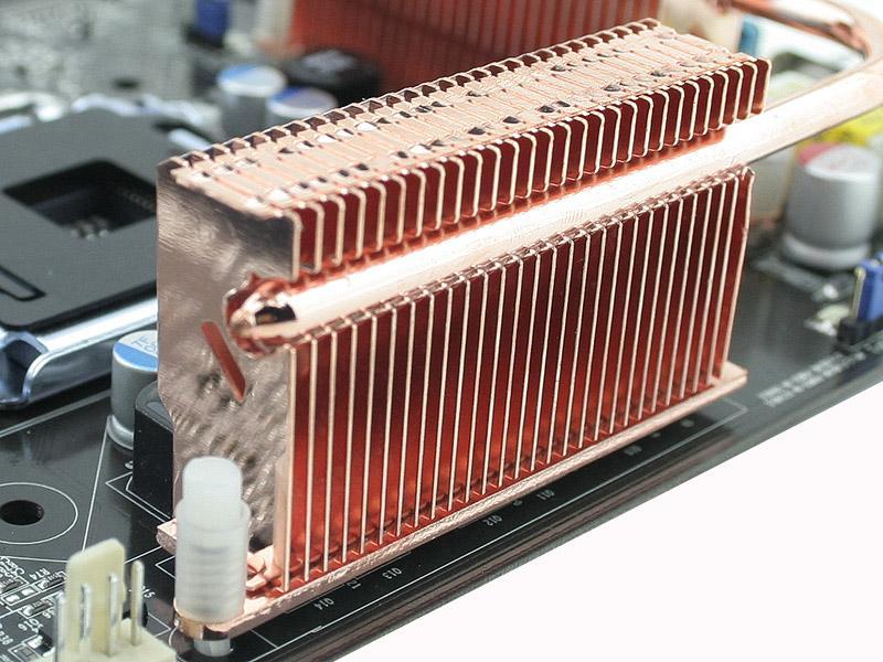 大家应该知道,北桥发热量比南桥高得多,但得益于热管散热系统的帮助,有效把南桥和CPU供电MOS管之间的散热片连接起来,增大了散热面积,热量能更快地传播开去,加上CPU风扇侧风的帮助,让温度有效的降低下来。其实在这里,CPU风扇所起到的作用也功不可没。下面把平台换成非热管的,我们来做一个简单的测试,结果绝对让你意想不到。