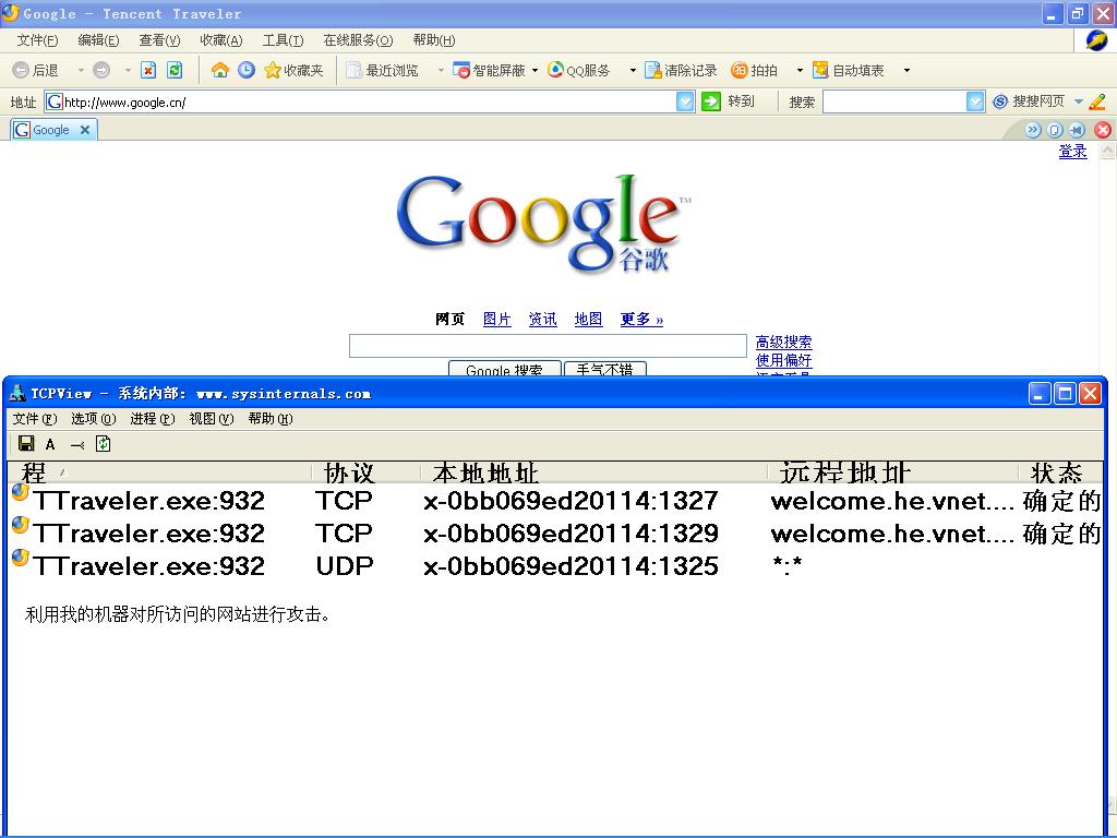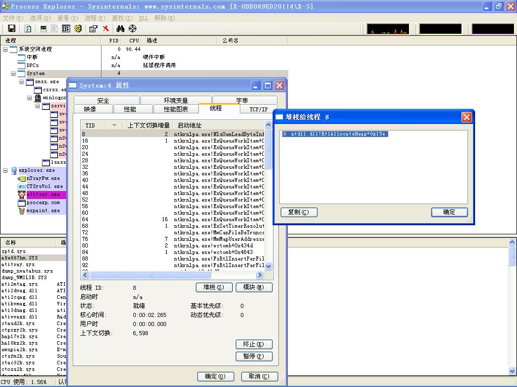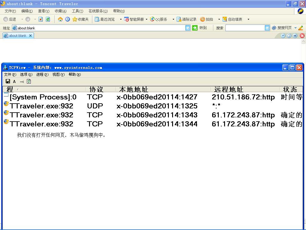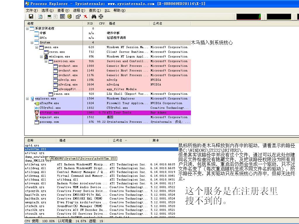 随机文件名的驱动只存在与系统核心内存中,没有启动项,驱动的名称在注册表里也找不到,相关的EXE文件也无法找到路径,似乎也是内存中的幽灵,平时若无其事,只要联网就凶相毕露,杀毒软件根本就是无奈的摆设,冰刃之类在我这菜虫手中也是杀不了耗子的钝刀,AUTORUNS\SREngPS也看不出任何异常。请看我的贴图,如何才能把这种木马拖出系统,请高人指点。[好像是飘雪木马的变种]