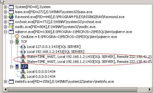 State=TIME_WAIT, Local 192.168.1.2:1433[SQL SERVER], Remote 222.138.41.21:1039