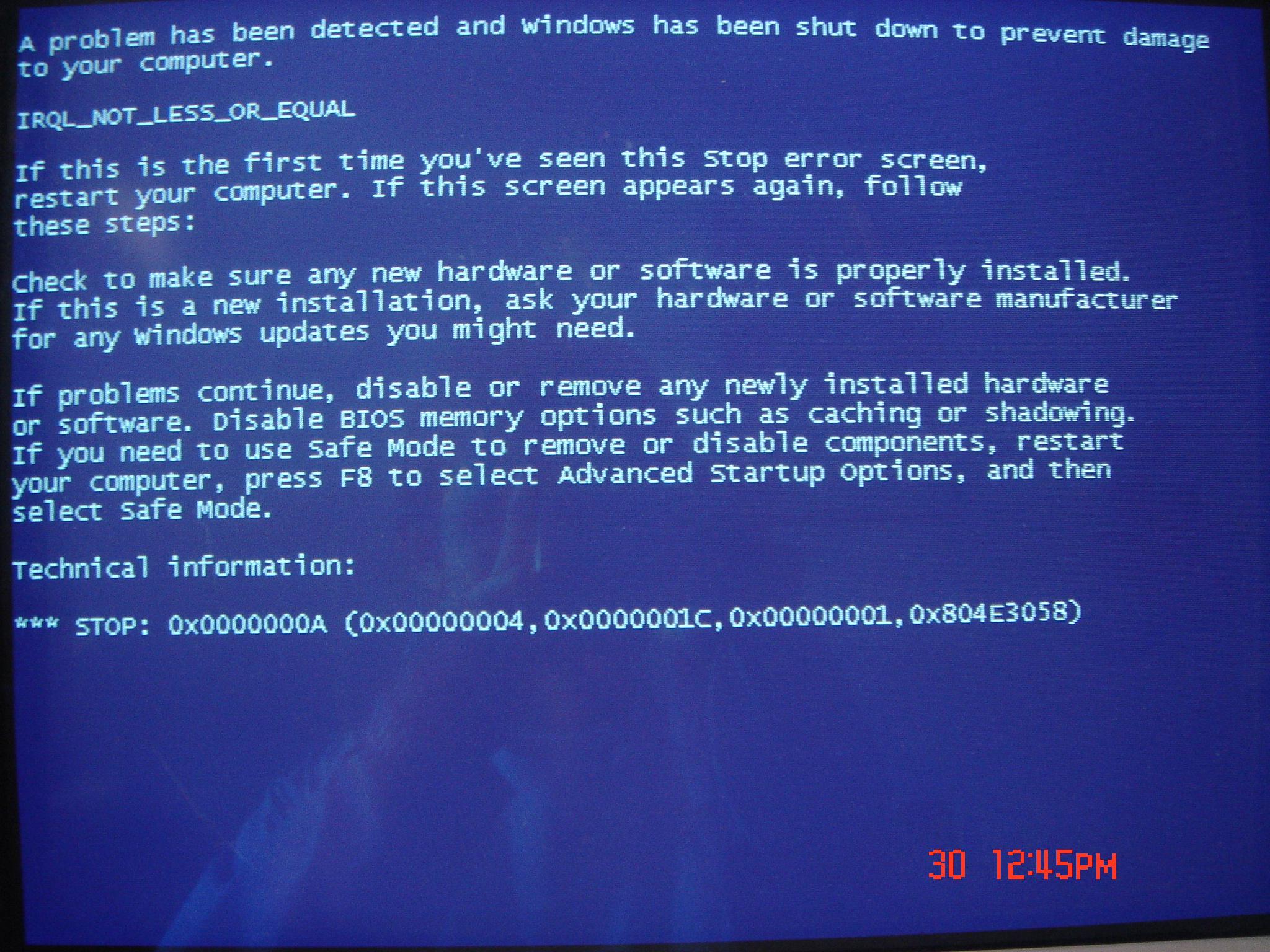 不知道是中病毒还是电脑硬件出了问题,电脑开机常常不到10分钟就会出现如图(蓝背景)的情况,重新启动的话有时就是黑屏没有反应,有时出现如图(黑背景)的情况,现在想用Real看点东西或做点别的事时总是这样,问题到底处在哪里呢?希望知道的好心的帮帮忙,尽快解决.