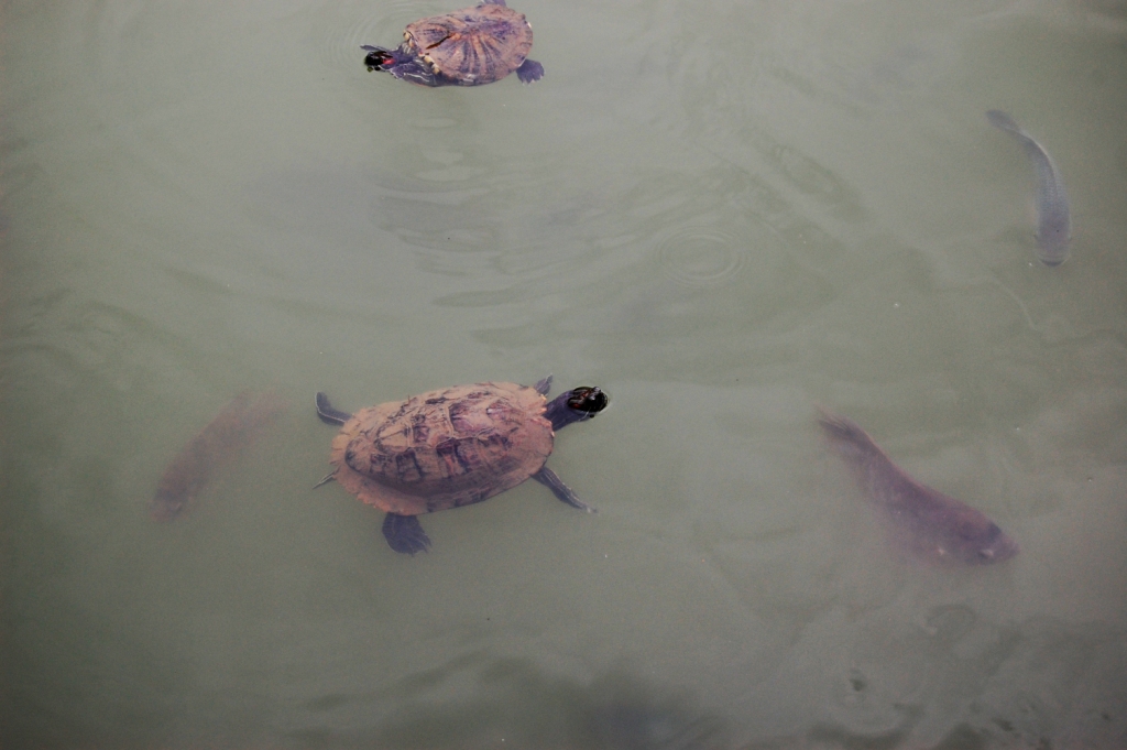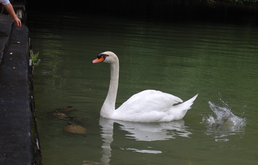 在植物园的Eco Lack,由于才下过雨,湖水并不很清,可是我居然看到好多的乌龟和鱼游在水面上,十分悠闲的样子!而且长得很大呢!旁边有人喂食面包,后来我知道这里的鱼和乌龟是可以喂食的,所以他们不怕人。湖中有个雕塑,是三只天鹅展翅飞翔的样子,果然我就看到有两只天鹅游了过来!洁白的羽毛,优美的长颈,黑色的额头,它们嘎嘎叫着向岸边游来,争抢着游客投下的面包屑。太有趣了!