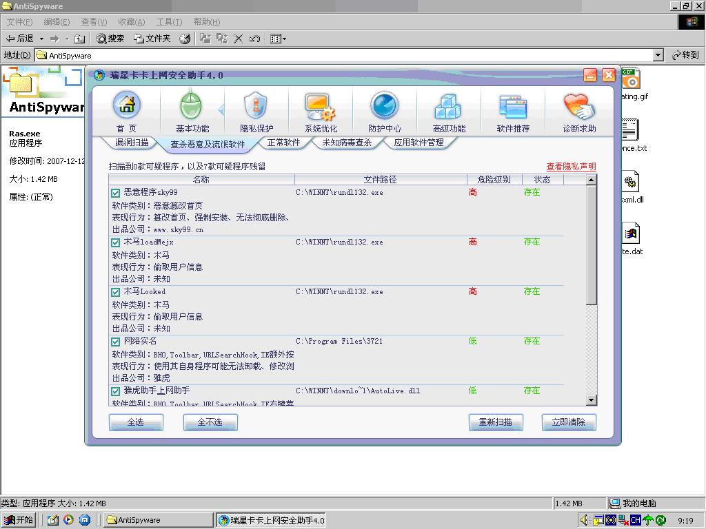 估计瑞星解决不了这个问题,我和你一样,不过你还比我好些,我机子里面的病毒和恶意程序用卡卡和瑞星杀毒软件都查不出来,还是用了360安全卫士查出来的,但是360也没法子彻底删除。我16号发的求助,道现在也没人给解决,只有一个什么人让我道360去解决,那我用瑞星还有什么意义?刚才有查了一下电脑,瑞星和卡卡还是什么也差不出来,360又查出来13个,我怕死了,没有办法又不想重新装系统,还是尽量别用什么密码之类的牵涉个人私密的东西吧!