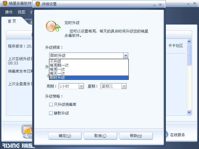 08版瑞星杀毒软件,有了一个“即时升级”的功能,设置后,瑞星会在后台自动升级,不会影响平时的操作。