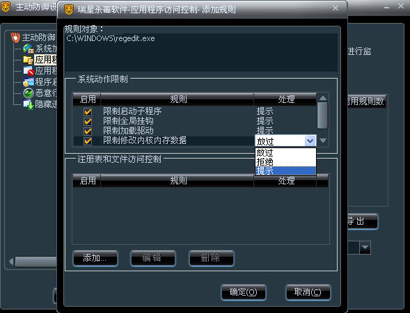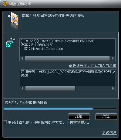 瑞星杀毒软件升级到08后,监控少了很多,原来大家经常见到的“注册表监控”没有了,监控只有3个“文件监控”,“网页监控”,“邮件监控”。而且,在以往的使用过程中,杀毒软件经常提示注册表被修改,选择“是”还是“否”的这些提示也都没有了,那注册表还安全吗?是不是会被任意修改了呢?