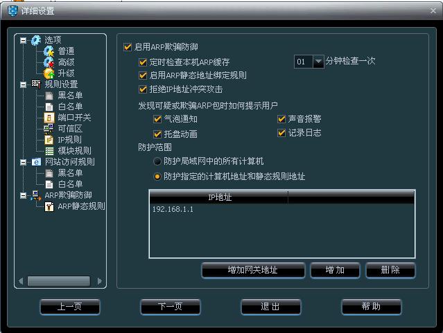 假如楼主是在局域网的话,请楼主先在[ARP欺骗防御]下面的[ARP静态规则]中设置好正确的网关IP地址并且[自动获取]MAC地址绑定。
