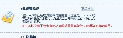 如果是u盘病毒免疫暂停,请看一下卡卡防护中心界面的说明