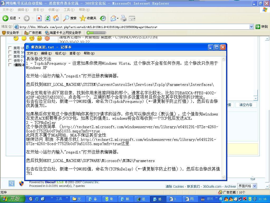 我以前安装了KIS7.0,用着用着忽然QQ空间开不开了,而且网易贺卡站的登陆帐号框没有了,还有其他一些网站的动态FLASH也看不到了,并且所有的网络论坛什么的帐号都无法自动登陆,手动登陆后刷新下望网页,帐号就又自动下线了,所以我把系统还原,安回了KAV5.0和瑞星防火墙,但今天再次出现这种问题,我把杀软和防火墙都关闭了,但问题仍然存在。我昨天用朋友的一个修改网络游戏延迟的注册表,(附件1)今天出现的问题不知道与那有关没,我把修改的删掉,但问题还存在,再说我之前按KIS7.0时也没修改注册表的啊。急求解决方法,或原因出处~~!!!