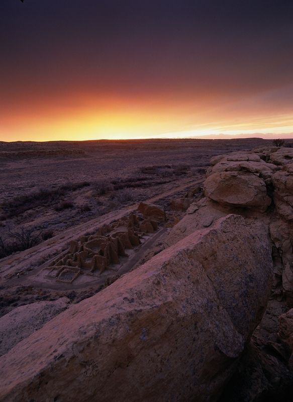 美国新墨西哥州西北部的石造士著集落住宅群,为后人留下了高度发达的查科文化的遗产。其中最大的土坯建筑物为12000平方米的半圆形结构。这些建筑物的定位被推测可能与太阳和月亮的方位有关。最让人感到神秘的是村落周边如同网络般的道路遗址,路宽9米.全长600公里,这些有明确的构思道路不仅是为连接周边村落之所用,更被认为是当时查科文化宇宙观的反映。