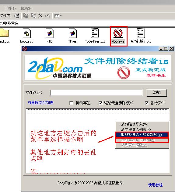 叫你:直接在下面大窗口的空白处,使用右键菜单的“剪贴板导入不检查路径”导入,并全选文件选择右键菜单的“立刻重启删除”