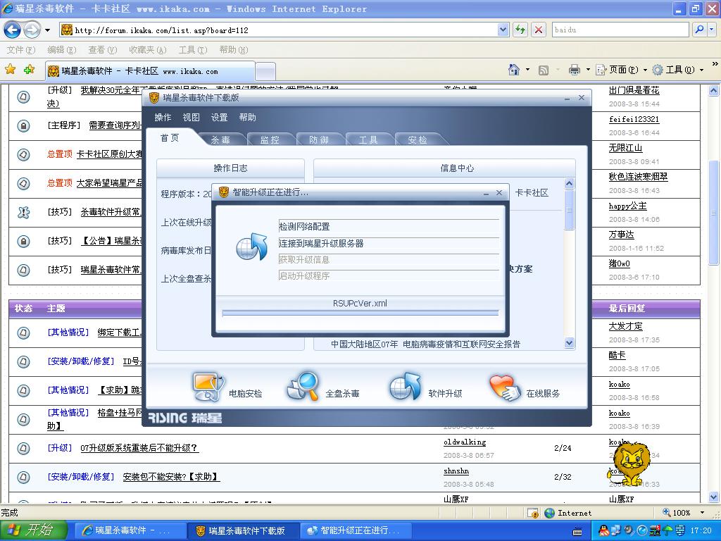 升级框到检测到瑞星服务器时进度条满了后不见了!附图