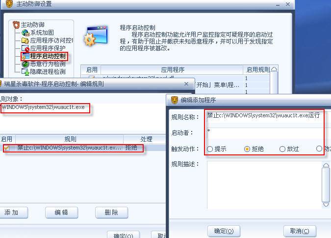 1、在瑞星2008的“主动防御”的“程序启动控制”中分别添加几条规则,禁止下列程序运行(设置例子见附图):