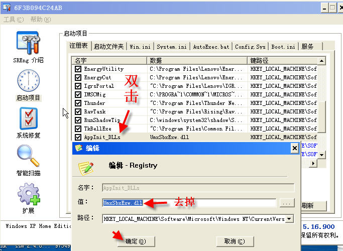 在扫日志的SRENG工具》启动项目》注册表》里面找下面项目删除:
