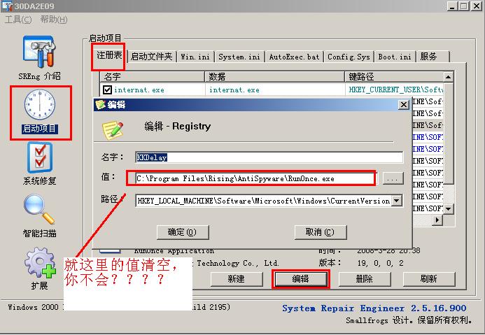 在扫日志的SRENG工具》启动项目》注册表》里将下面项目置空(就是选择“编辑”)这必须关闭杀毒软件的监控,否则改不了可能。