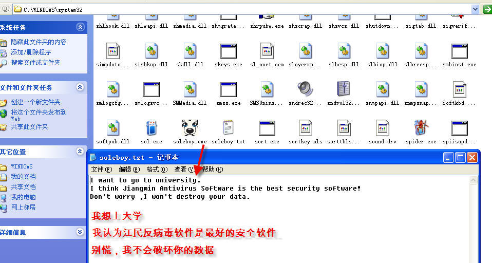 2、在系统目录(system32)下释放病毒文件soleboy.exe和soleboy.txt。删除taskkill.exe。