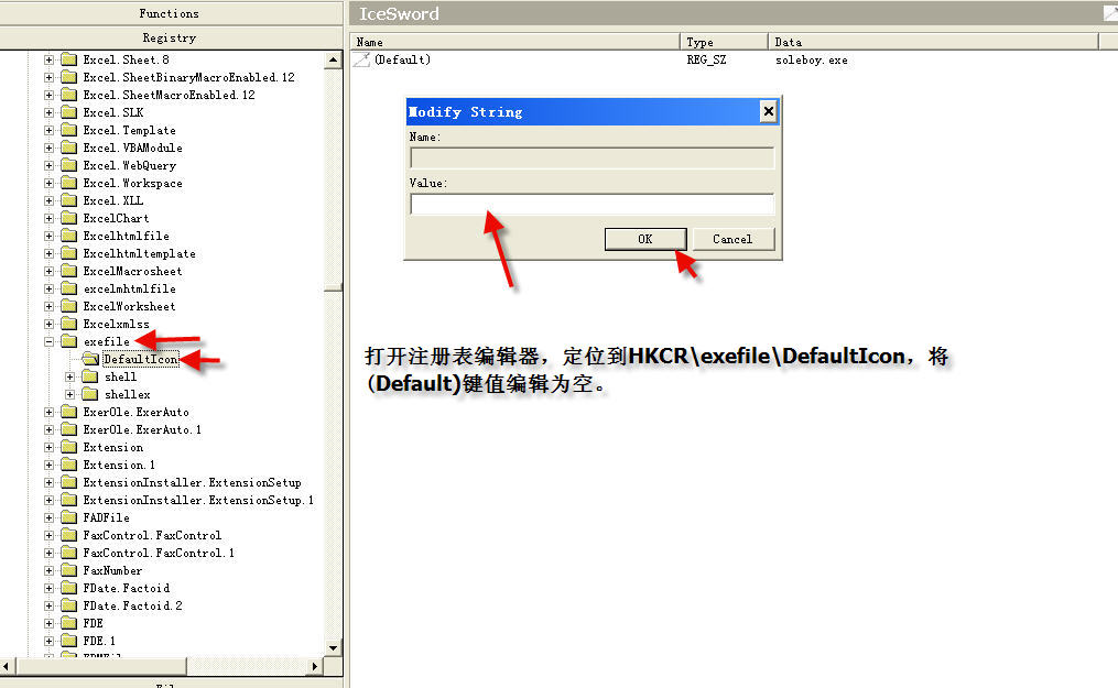 4、将HKCR\exefile\DefaultIcon的键值编辑未空(图6)。