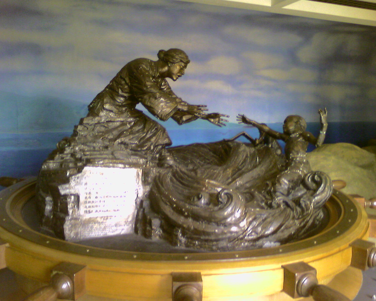相传很早以前,有一南方北上的商船突遇狂风袭击,数日不见陆地,粮食淡水都用光了,人们绝望了,只好听天由命地随波逐流。一天夜里,一个水手无意中忽然发现前面有火光,便兴奋的大叫起来:“有救了,有救了!”他们知道有火必有人,有人就有救了。这一线希望马上激起了人们的力量,他们拼命地向火光方向划船,终于看清前面是一海岛,有一位老人站在岸边,手举火把为他们引路。船靠了岸,船上的人们跳进浅水,扑向岸边,一个个先后栽倒在沙滩上。老人把他们背到自己的草屋子里,介绍说:“我姓刘,大家叫我刘公好了。”刘公的老伴也是位和善的老人,只见她抓了一把米放到锅里,一会儿就煮熟了。十几个人狼吞虎咽地吃了一碗又一碗,锅里的饭始终不见少,船民们恍然大悟:这是遇到救命神仙了,忙跪下磕头。等抬起头来,刘公夫妇已不见了。第二天打听岛上的居民,他们也说刘公刘母经常做这样的善事。后来这些人为了感谢刘公夫妇的救命之恩,联合岛上的居民在岛上修建了刘公刘母祠,并把此岛取名叫刘公岛。