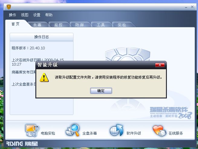我的瑞星杀毒软件开机自己不启动了 自己打开一点全盘杀毒就自己关了 升级就出现下面照片情况 怎么处理呀 谢谢好心人了 谢谢