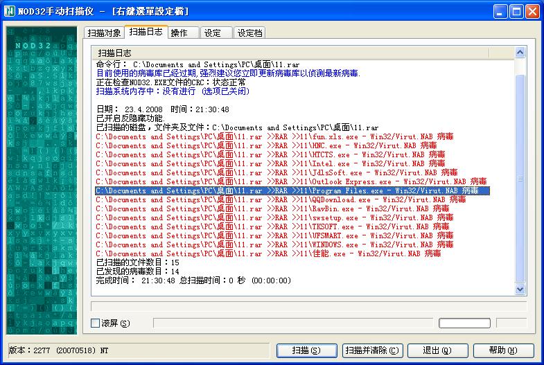 请注意看下NOD32的病毒库时间,而我美丽的瑞星可是今天最新版本。更加糟糕的是瑞星提示发现了瑞星目录下的RAVUPDTN.EXE感染病毒,需要重新启动,重新启动后无法打开伞。