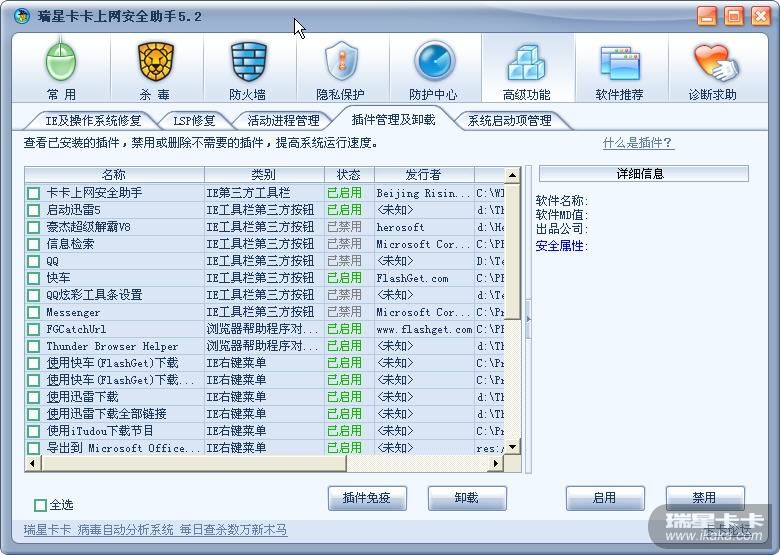 依托瑞星的专业反病毒技术,应用碎甲(Anti-Rootkits)、Startup Scan等反病毒核心功能,轻松清除带有自我保护、自我隐藏的顽固性流氓软件。