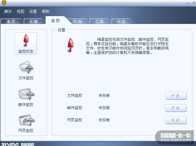 为什么我的监控设置打不开.右下角的伞是绿的.但瑞星里的伞是红的,而且说监控文件未安装啊.望高高高人赐教~~