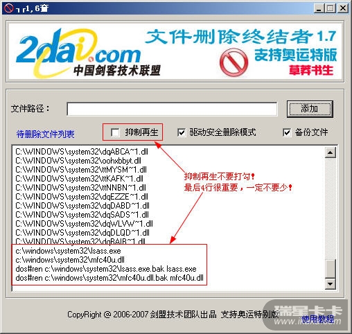不要勾选“抑制再生”,勾选“驱动安全删除模式”、“备份文件”,最后选择右键菜单的“立刻重启删除”。