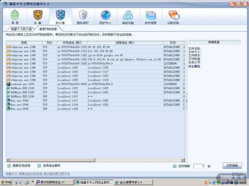 到现在,我都还不明白,为什么瑞星的rfwproxy.exe会连接远程地址,地址IP解释为:jp-in-f104.google.com:80;155.9.143.61.broad.jm.gd.dynamic.163data.com.cn:80;pq-in-f104.google.com:80;ti-in-f104.google.com:80;(还有很多)