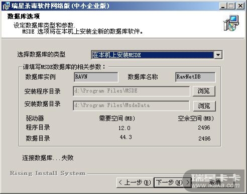 瑞星2008网络版安装时,选 MSDE数据库后,无法连接数据库
