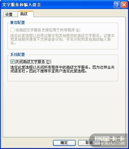 “设置”中“语言栏”灰显,“高级”的“关闭高级文字服务”前一直是打钩状态(去不掉)如图2,3