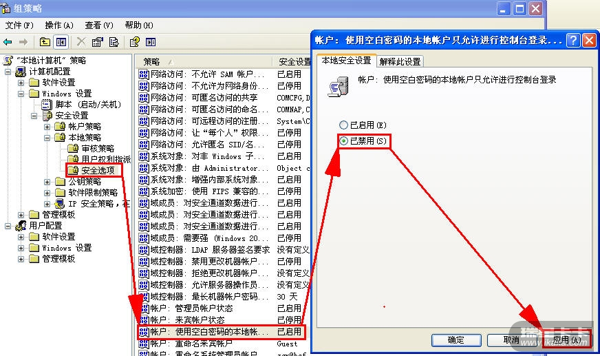 帐户:使用空白密码的本地帐户 禁用 和启用也是灰的 更本不能设