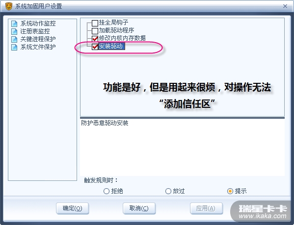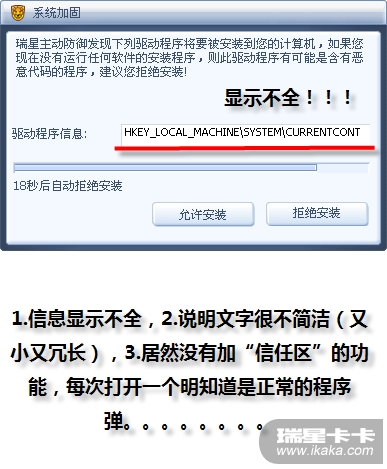 对于用户而言,只想知道有用的信息。这么多字,下边还有一个倒记时,这不是赶着用户作决定吗?完全可以只显示关键字并加亮。这一点可以学习一下卡巴。