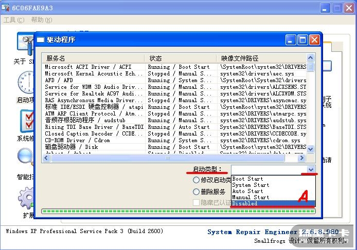 2.删除重启后使用SREng修复下面各项: 启动项目 -- 服务-- 驱动程序之如下项禁用: