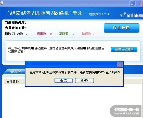 打开金山公司的专杀工具后,直接点开始扫描,隔了一会就会出现一个如图2对话框,点是