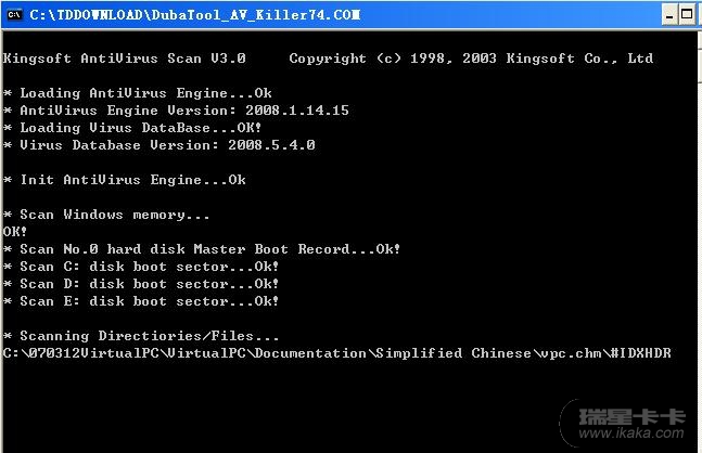 这里你们应该可以看到最下一行是C:开头的,当你看到他变成d:\或别的你就可以手动把它关了,因为C盘已杀完了。不知道为什么试过N次只能杀出C盘的文件(当然我的系统是装在C盘,你们的系统装在别的盘就不同了)。然后再把图2那个窗口关了,也许细心的你会看到他还在杀毒,不过你可以不用理会他了,直接关掉。然后重启,进入到安全模式,打开你放在桌面的那个AV专杀,再杀一次,同前面一样杀完C盘的就关掉他。这次扫描相对来说比前一次一般要快一半多,很快的
