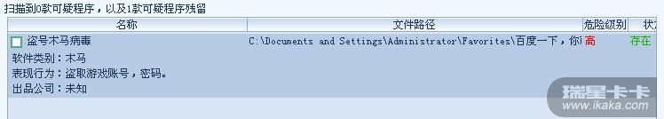 一样我的也是这样把百度网址给杀掉了,瑞星杀软都没扫描到.用金山清理专家最新版本也没发现,估计还是卡卡误报了.清理后百度网页就不在收藏夹里了.- -!