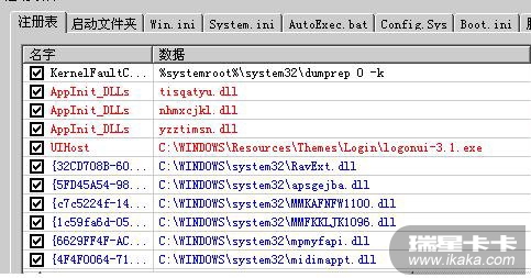 注意该项[AppInit_DLLs]修改:把<tisqatyu.dll,nhmxcjkl.dll,yzztimsn.dll>修改为<>即清空