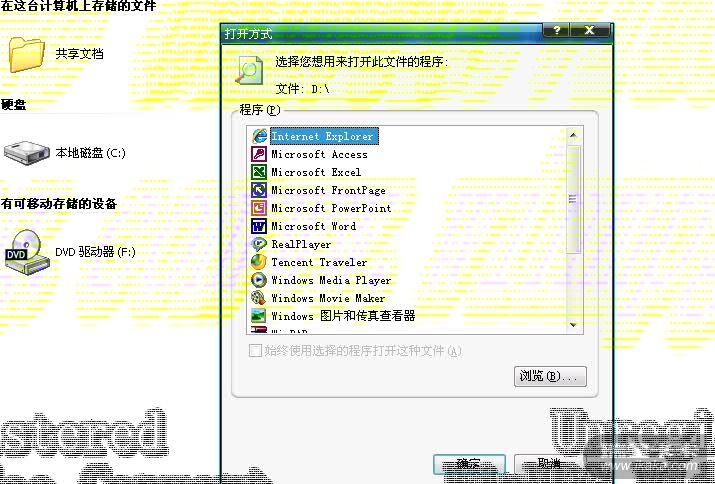 打开“我的电脑”后,再双击C、D、E盘符,打不开文件夹,而是出现“选择用何种程序打开”的那个对话框,在盘符上点右键,第一行出现的是“资源管理器”,麻烦明白的人给指点一下,不胜感激!